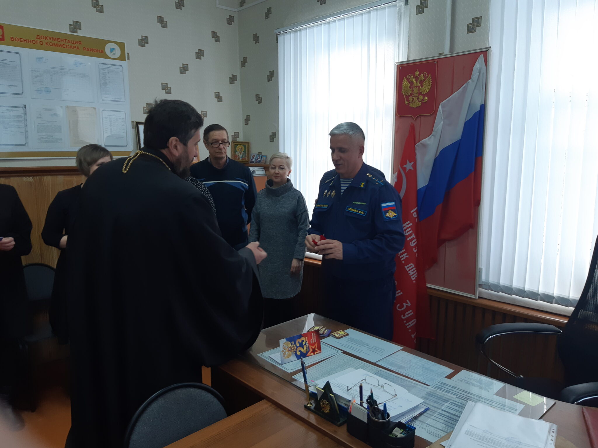 В преддверии Дня защитника Отечества благочинный Суражского церковного округа протоиерей Владимир Фараон сердечно поздравил военного комиссара по Суражскому району Сергея Николаевича Агеенко и сотрудников военкомата г.Суража с Днем защитника Отечества. Отец Владимир выразил слова благодарности работникам военкомата за особый вклад в обеспечение страны военным потенциалом и воспитание патриотического настроения у будущих воинов. Батюшка благословил тружеников военкомата на дальнейшие труды и преподнес в дар иконки.