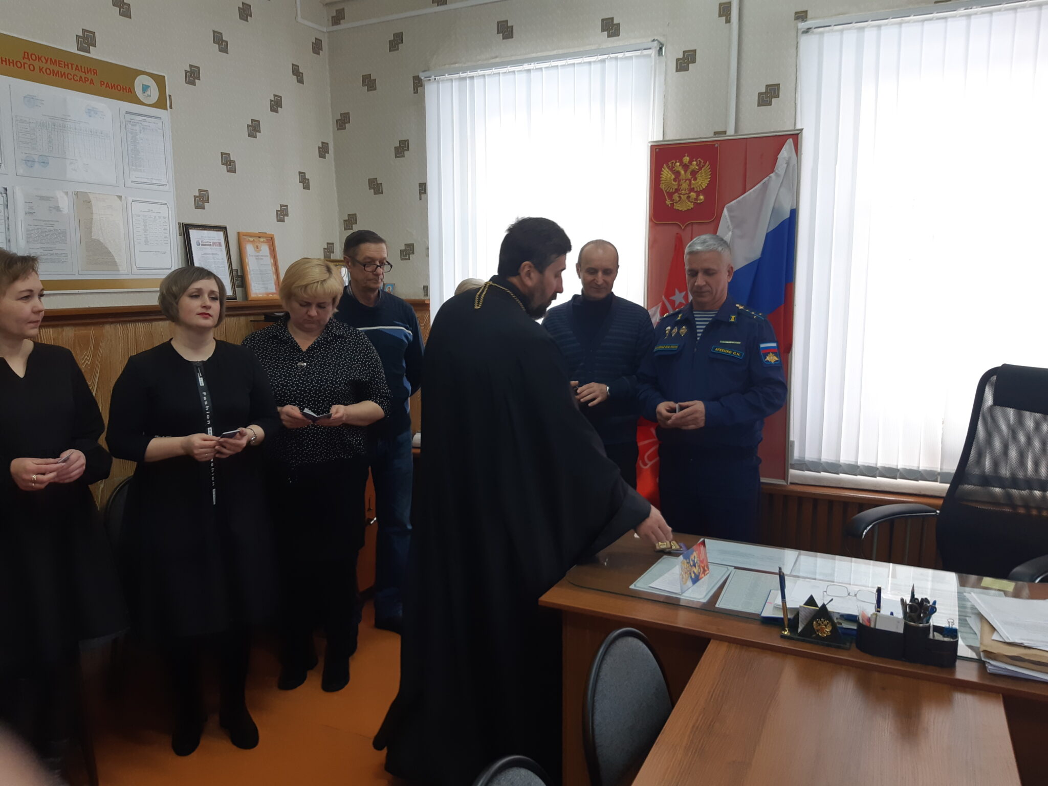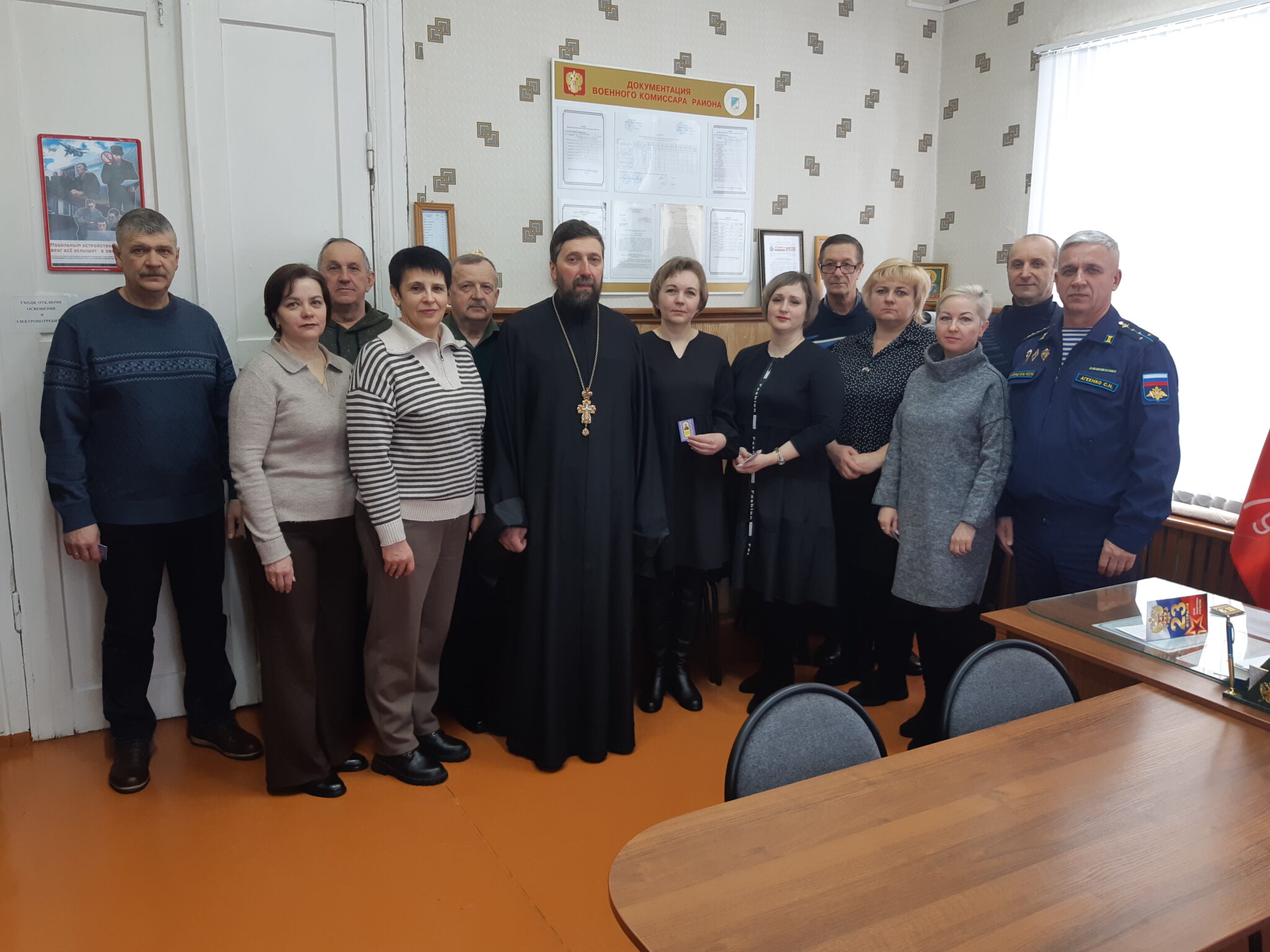 В преддверии Дня защитника Отечества благочинный Суражского церковного округа протоиерей Владимир Фараон сердечно поздравил военного комиссара по Суражскому району Сергея Николаевича Агеенко и сотрудников военкомата г.Суража с Днем защитника Отечества. Отец Владимир выразил слова благодарности работникам военкомата за особый вклад в обеспечение страны военным потенциалом и воспитание патриотического настроения у будущих воинов. Батюшка благословил тружеников военкомата на дальнейшие труды и преподнес в дар иконки.