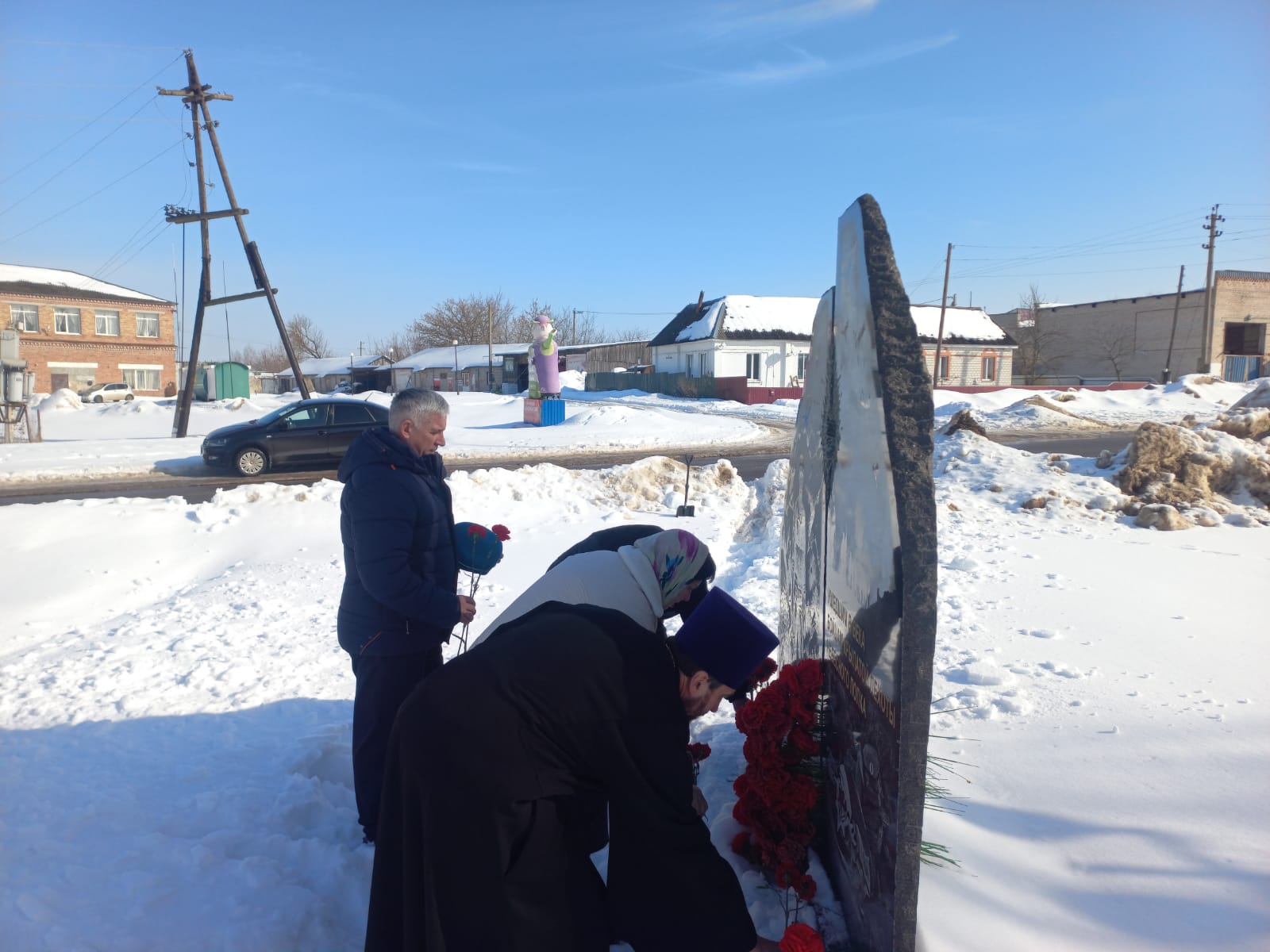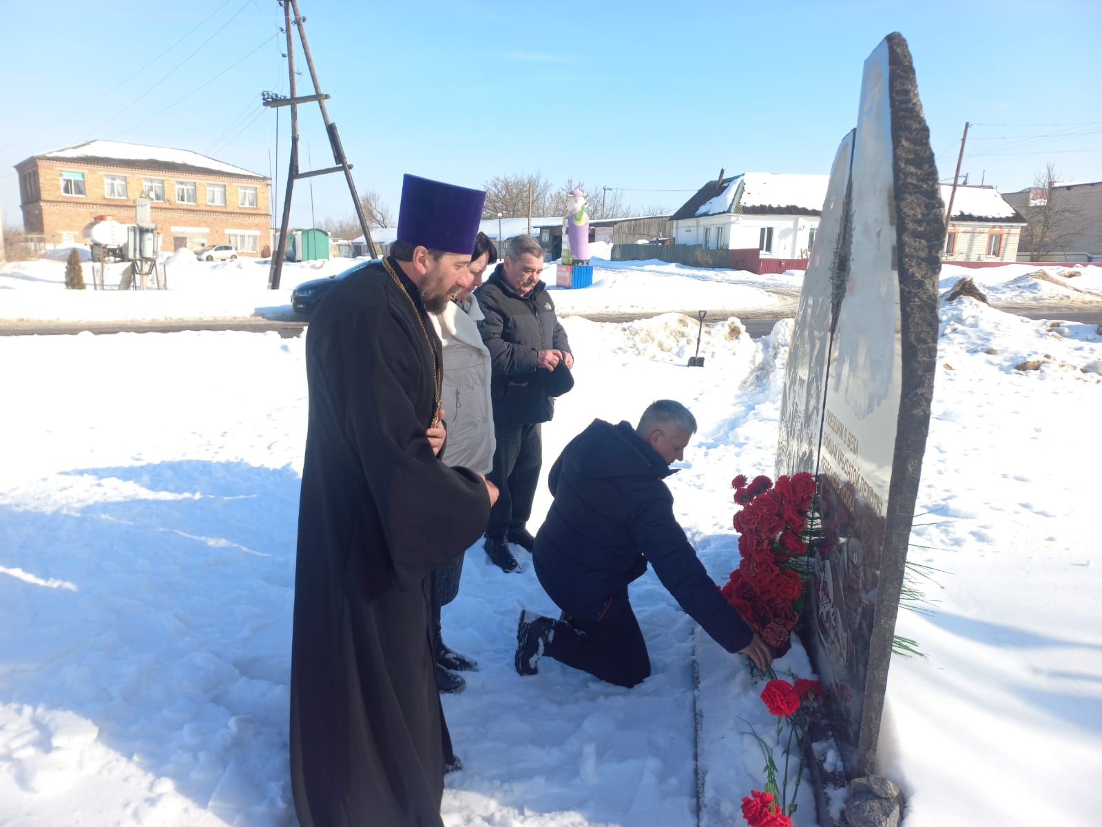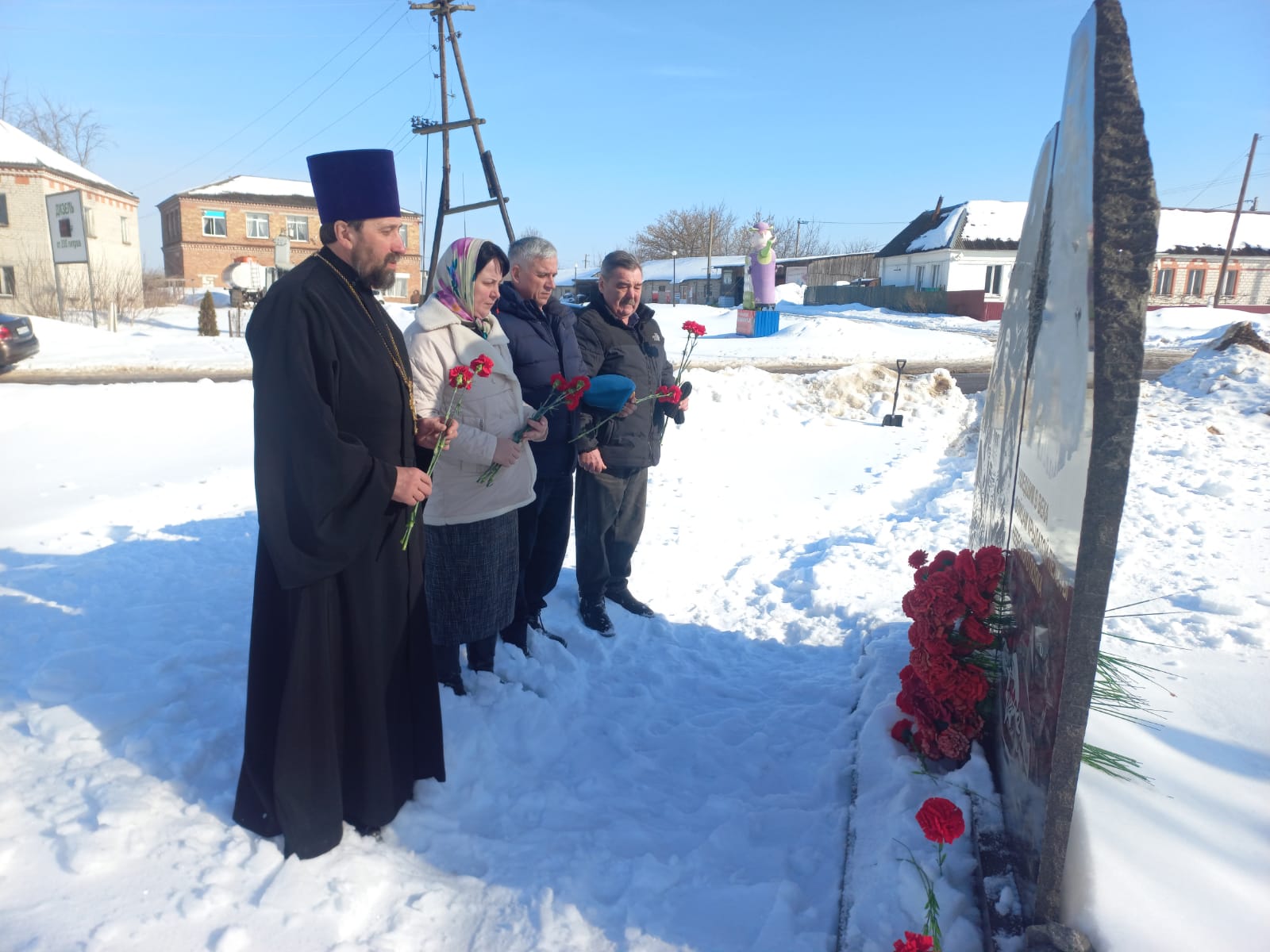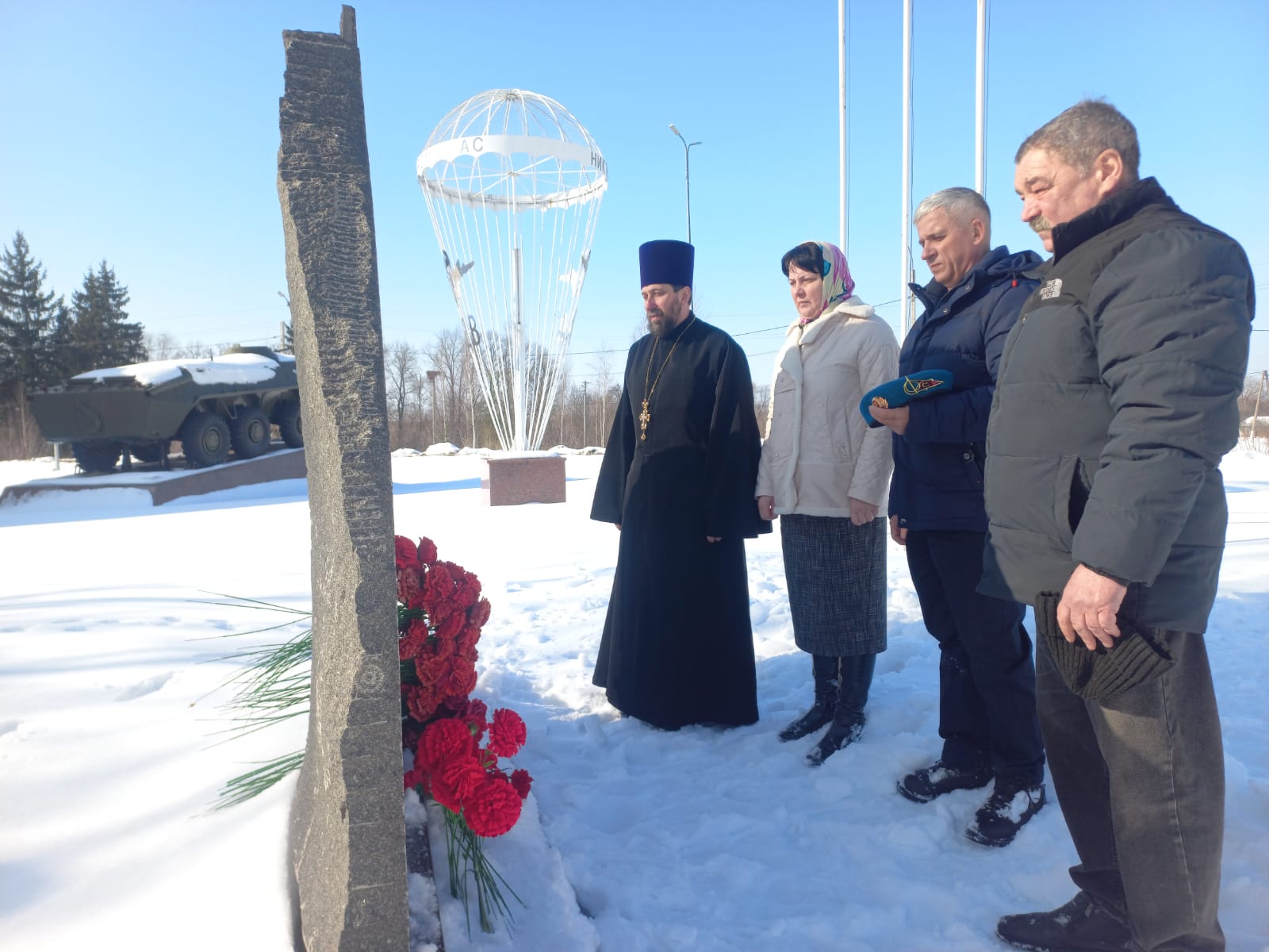 К памятнику героям-десантникам отец Владимир, Сергей Николаевич Агеенко, Светлана Владимировна Толоко и Александр Петрович Нечипай возложили цветы.